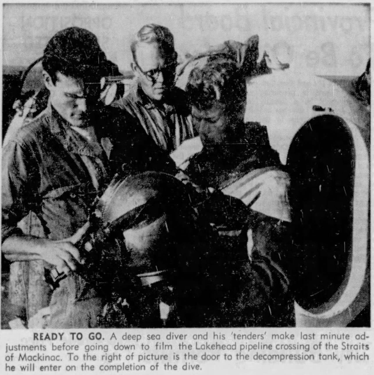 In the fall of that year, Enbridge—remember they were called Lakehead Pipe Line then—performed their first comprehensive underwater inspection of the dual pipelines beneath the Straits. They made a bit of a show of it, enough that the story appeared in newspapers from Calgary to Bay City, accompanied by photos of scuba divers and their camera equipment. Orchestrated by Bechtel, the contractor who oversaw the Line 5 project (you might recall that I’ve written about them before here and here), the filming required several teams of divers and took seven weeks. Lakehead officials announced that “the pipelines appear to be in good condition, but detailed examination of the film remains to be completed.”